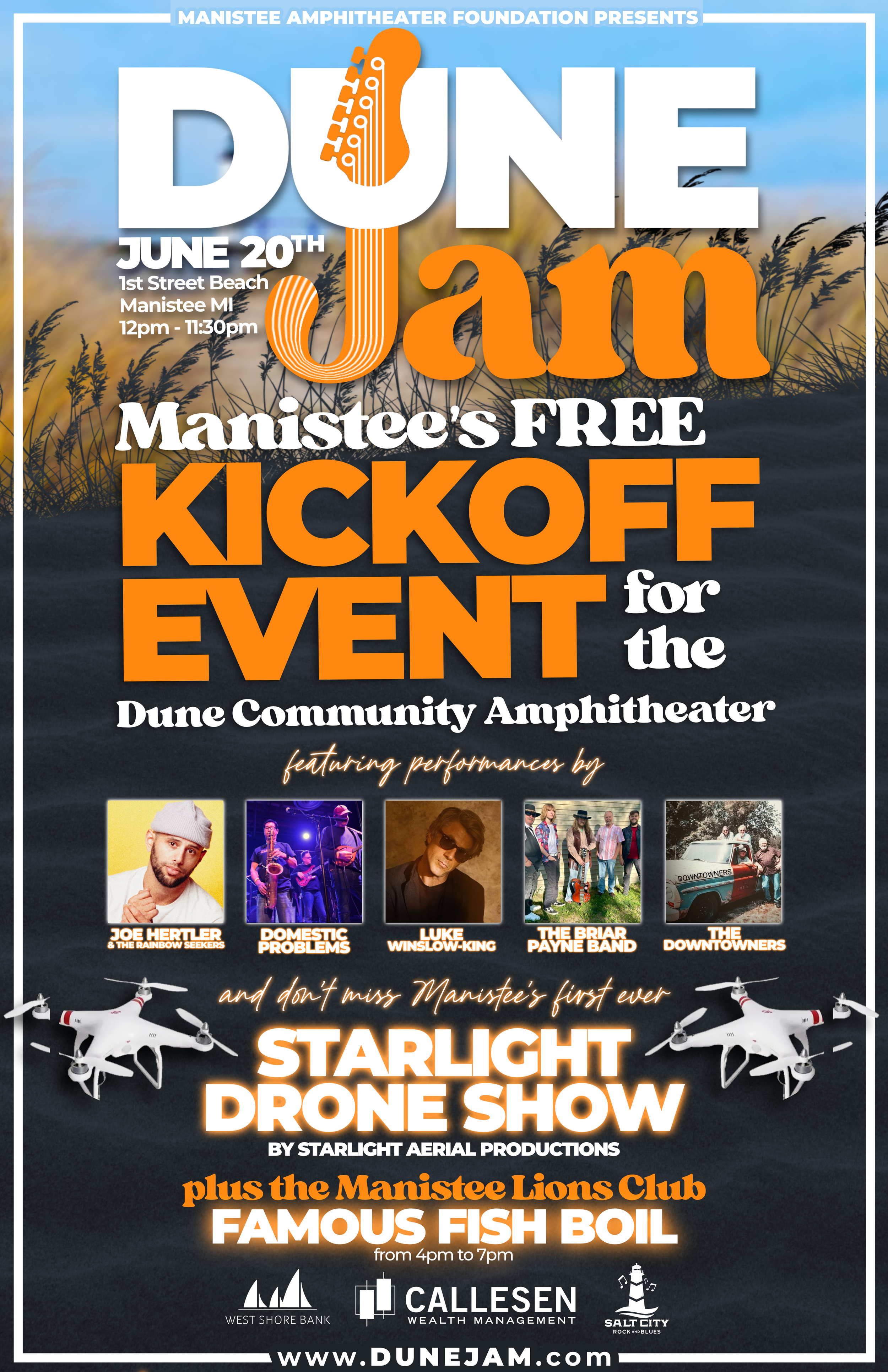 The First Annual “Dune Jam” will feature a full-day of music by top-tier Michigan bands, the return of the Famous Manistee Lion’s Fish Boil and a world-class drone show over the harbor at 10:30. This FREE event will serve as the kickoff of public fundraising phase of the MAF capital campaign and be held yearly as a fundraiser to support the endowment and long-term asset management plan for this one-of-a-kind venue.